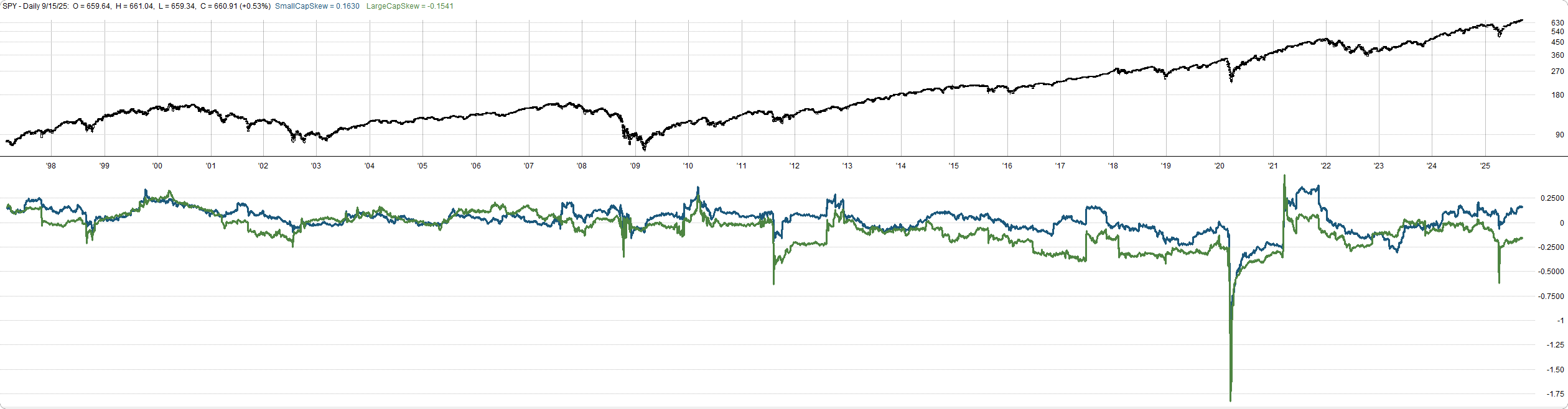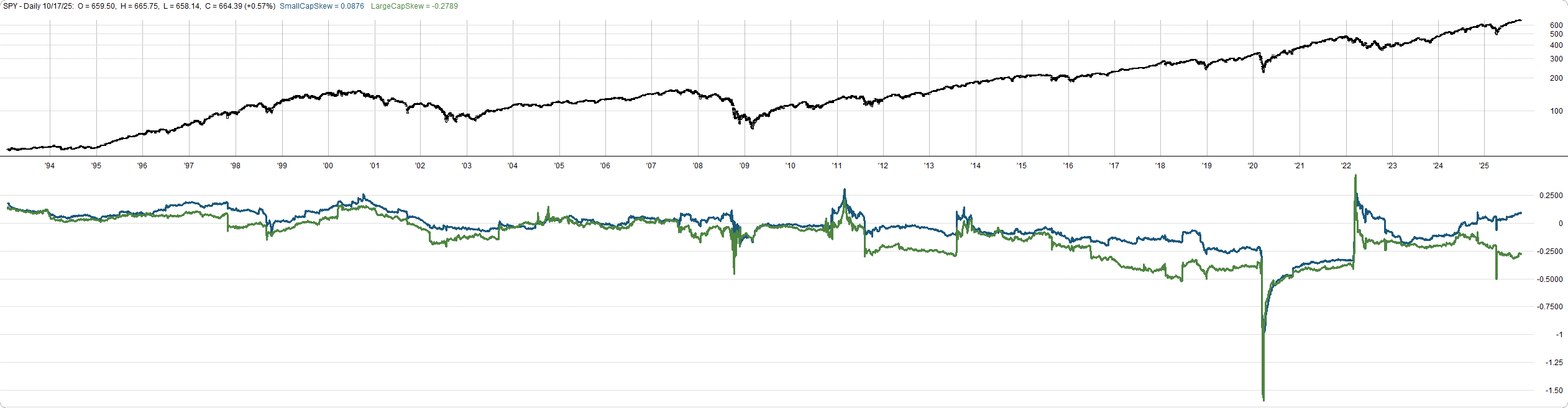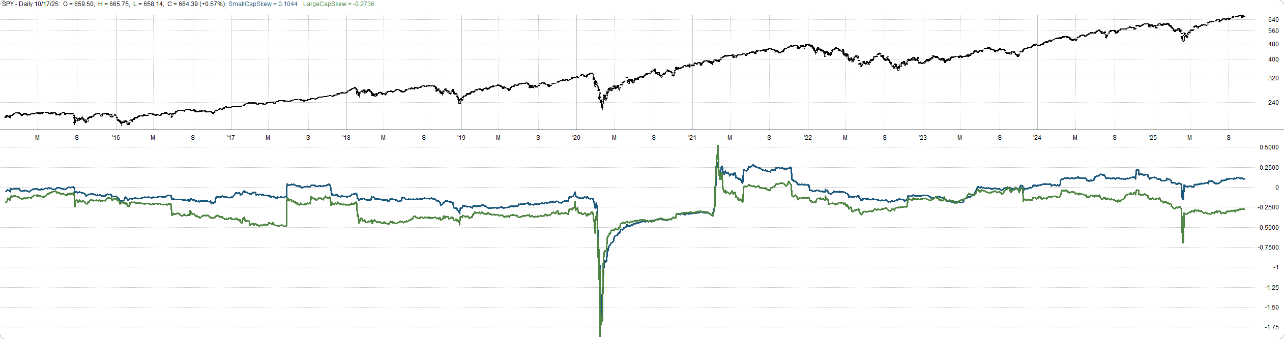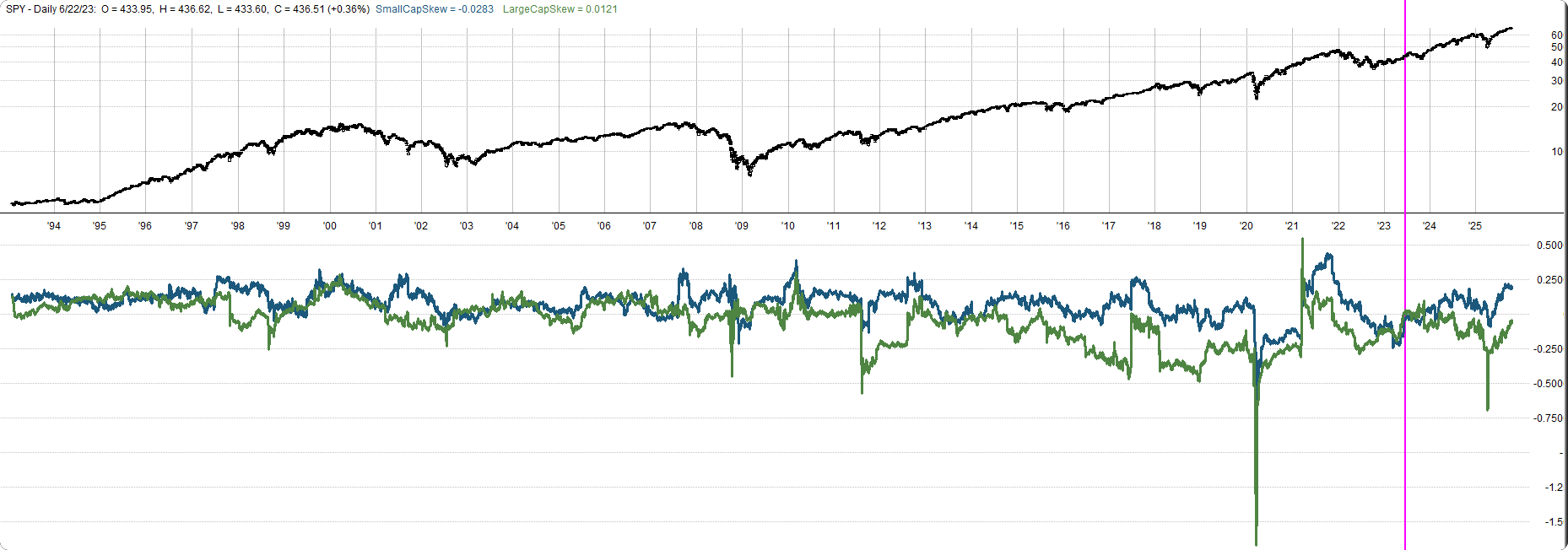 Here’s the 500-day historical skew. Same story. Small caps maintain positive skew even through volatile periods.
