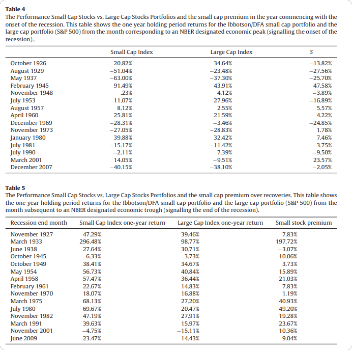 This table shows how small companies compare to big companies during big drops in the market. The pattern is: small stocks beat big stocks in the year after a recession, but they fall behind before the market reaches its highest point.
