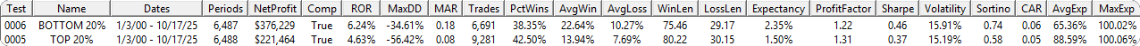 The bottom 20% has higher average wins, lower average losses, and better drawdown profiles.